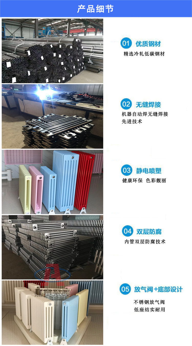 散热器外表喷塑处理,表面光滑整洁,易于清除灰尘,装饰性强。具有耐腐蚀、承压高特点。钢制柱型散热器是非常常用的一种暖气片产品,