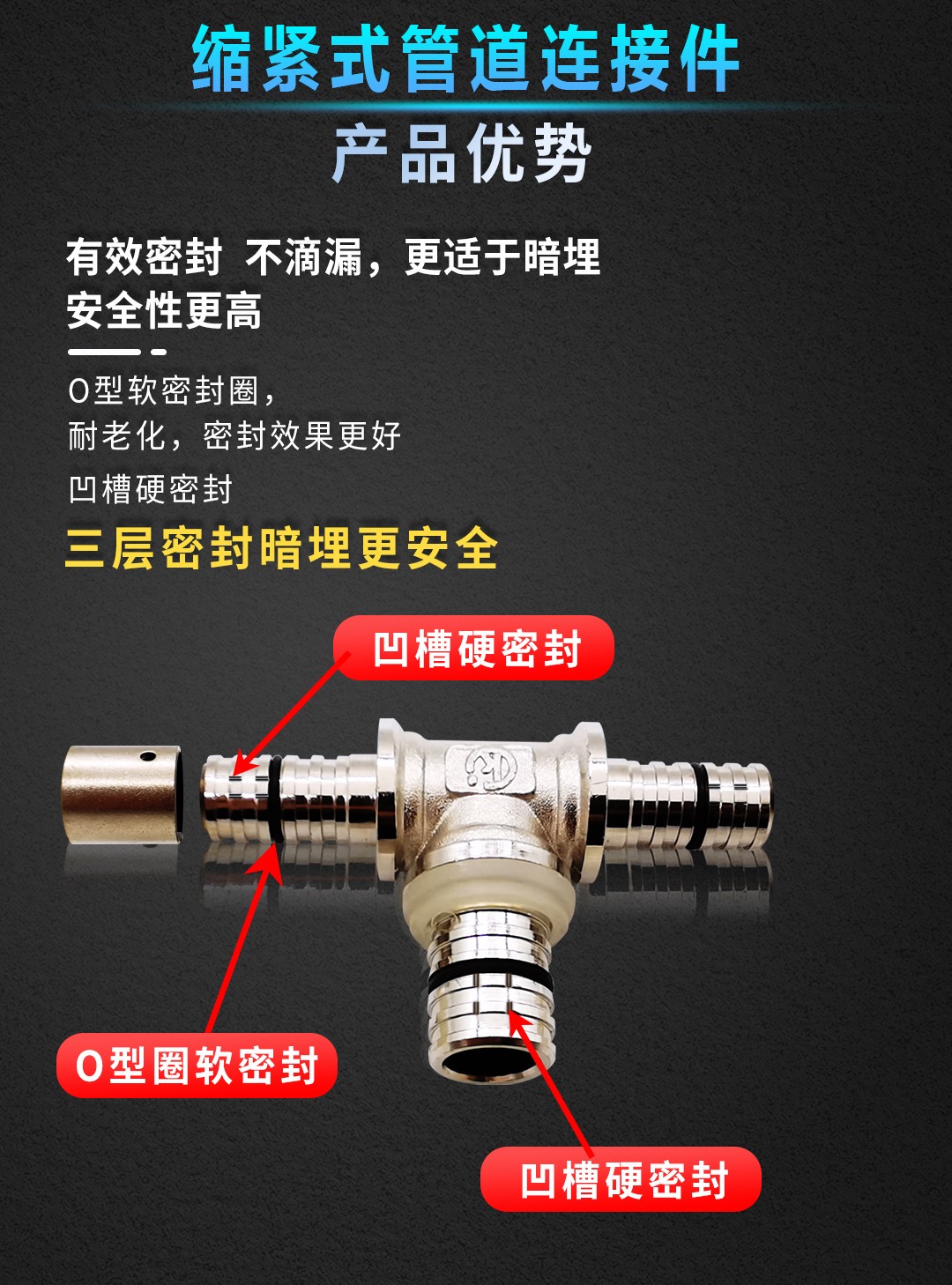 康威斯曼缩紧式管道连接件~内丝直接:有效密封不滴漏,更适于暗埋,安全性更高; O型软密封圈,耐老化,密封效果好,凹槽硬密封; 采用紫铜,表面镀镍,使用更美观,寿命更长。