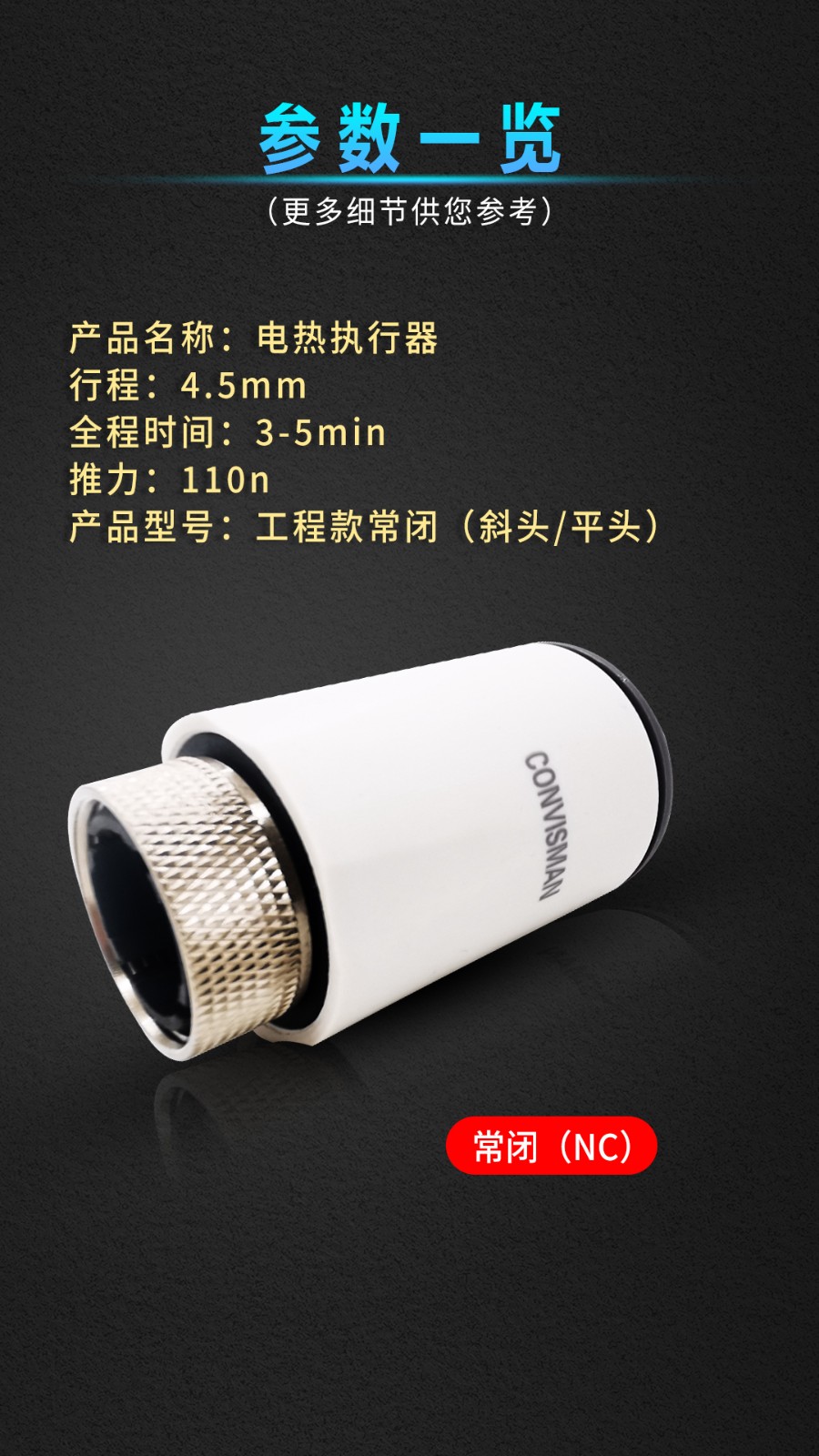 康威斯曼电热执行器:性能特点: 1.电热执行器体积小,重量轻节能、环保(采用弹簧自动复位省电、用热膨胀原理工作无嗓音),安装与拆卸方便快捷,主要用于地暖分水器,中央空调(水系统)、小型阀门的开启与关闭。常闭型执行器通电后阀门将自动打开,常开型 通电后阀门将自动关闭,用户在选购时必须明确执行器的类型后再购买。 技术参数: 工作电压:230V/AC50/60Hz 功耗:3VA 工作温度:最大60℃ 连接方式:螺母(M30x1.5)