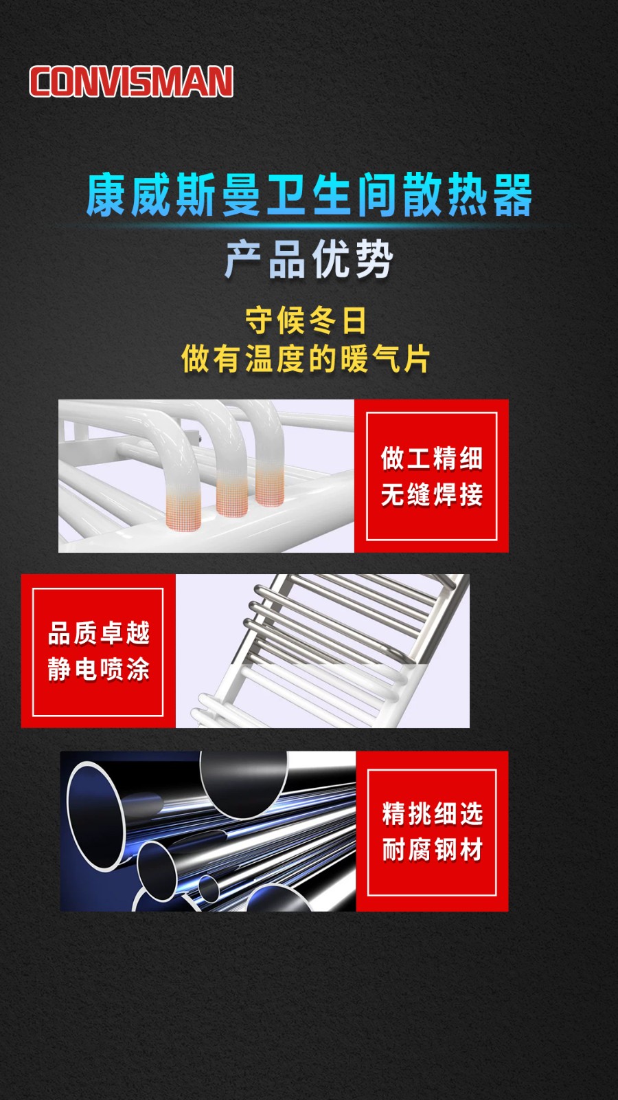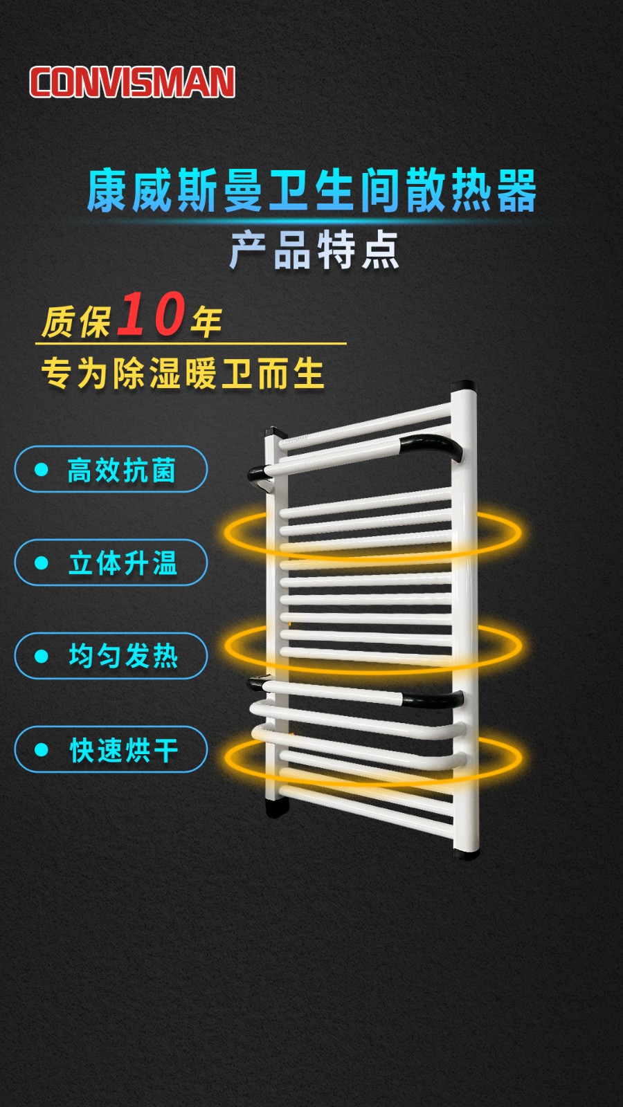 康威斯曼卫生间散热器(圆管):超全功能,做工精细,无缝焊接,品质卓越,静电喷涂,精挑细选,腐蚀钢材,高效抗菌,立体升温,均匀发热,快速烘干,多层防水防漏电。