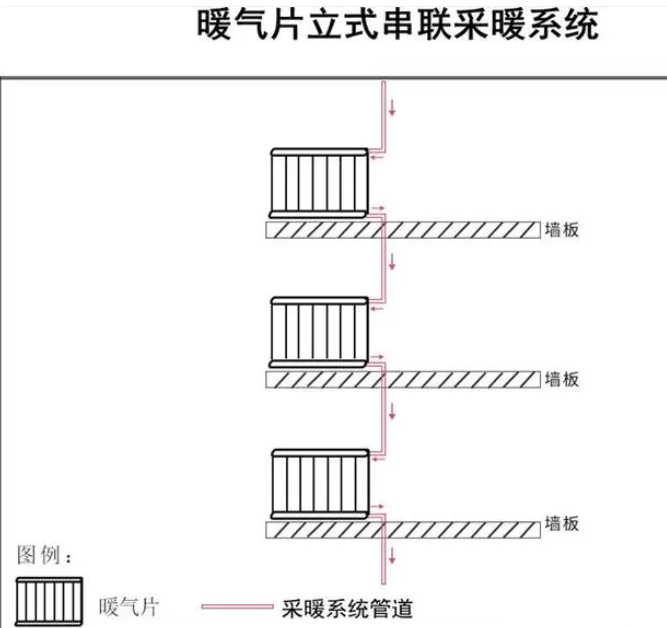如下图一,又可以叫着上下串联,楼上楼下不同楼层同一个位置的房间安装的暖气片串联在一起,第一组暖气片的进水口与热源连接,然后用一根采暖管道将前一组暖气片的回水口与后一组暖气片的进水口连接在一起,最后一组暖气片的回水口再用采暖系统管道与热源连接。