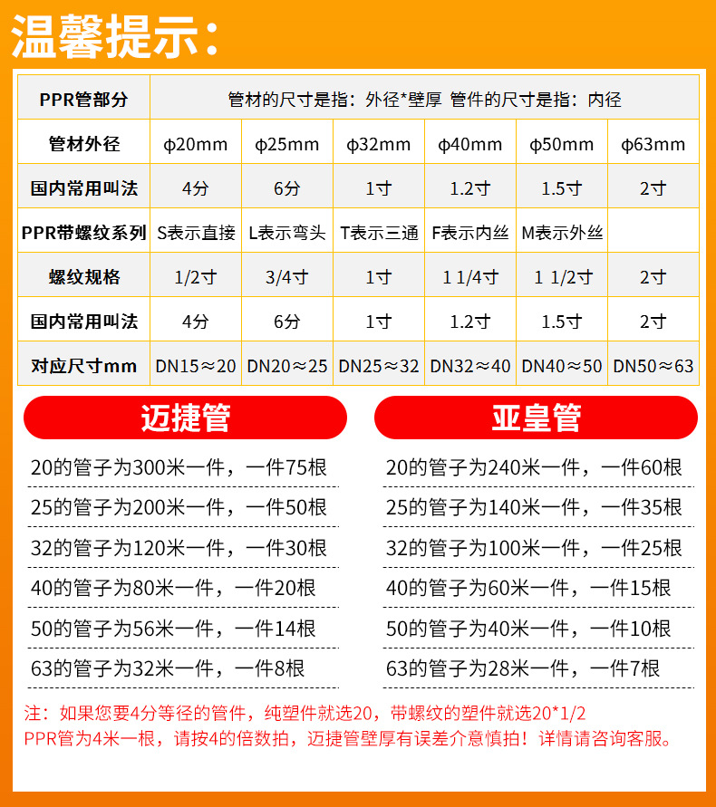 ppr冷热水管6分ppr管材排水管4分ppr自来水管:亚皇/迈捷 PPR冷热水管,20*2.3冷水管(迈捷300米/件),20*2.8冷热水管(迈捷300米/件),20*3.4冷热水管(迈捷300米/件),25*2.3冷水管(迈捷200米/件),25*2.8冷水管(迈捷200米/件),25*3.5冷热水管(迈捷200米/件),25*4.2冷热水管(迈捷200米/件),32*3.0冷水管(迈捷120米/件),32*3.6冷水管(迈捷120米/件),32*4.4冷热水管(迈捷120米/件),32*5.4冷热水管(迈捷120米/件),20*2.8冷热水管(双色管300米/件),25*3.5冷热水管(双色管200米/件),32*4.4冷热水管(双色管120米/件),20*2.3冷水管(亚皇白300米/件),20*2.8冷热水管(亚皇白300米/件),20*3.4冷热水管(亚皇白240米/件),25*2.3冷水管(亚皇白140米/件),25*2.8冷水管(亚皇白140米/件),25*3.5冷热水管(亚皇白140米/件),25*4.2冷热水管(亚皇白140米/件),32*3.0冷水管(亚皇白100米/件),32*3.6冷水管(亚皇白140米/件),32*4.4冷热水管(亚皇白100米/件),32*5.4冷热水管(亚皇白100米/件),20*2.8冷热水管(亚皇绿240米/件),20*3.4冷热水管(亚皇绿240米/件),25*3.5冷热水管(亚皇绿140米/件),25*4.2冷热水管(亚皇绿140米/件),32*4.4冷热水管(亚皇绿100米/件),32*5.4冷热水管(亚皇绿100米/件)