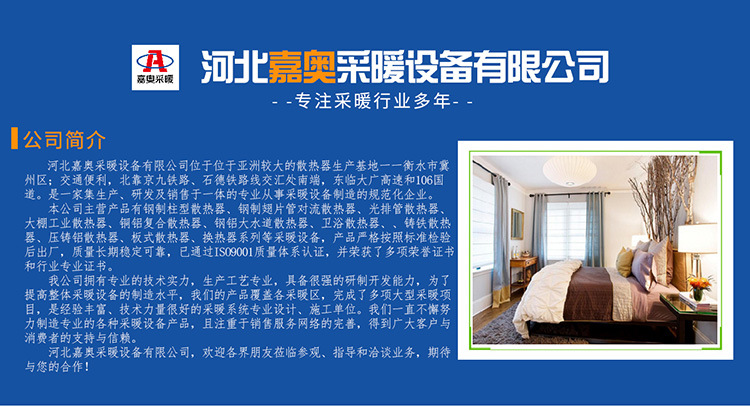 河北嘉奥采暖设备有限公司位于位于亚洲较大的散热器生产基地一一衡水市冀州区;交通便利,北靠京九铁路、石德铁路线交汇处南端,东临大