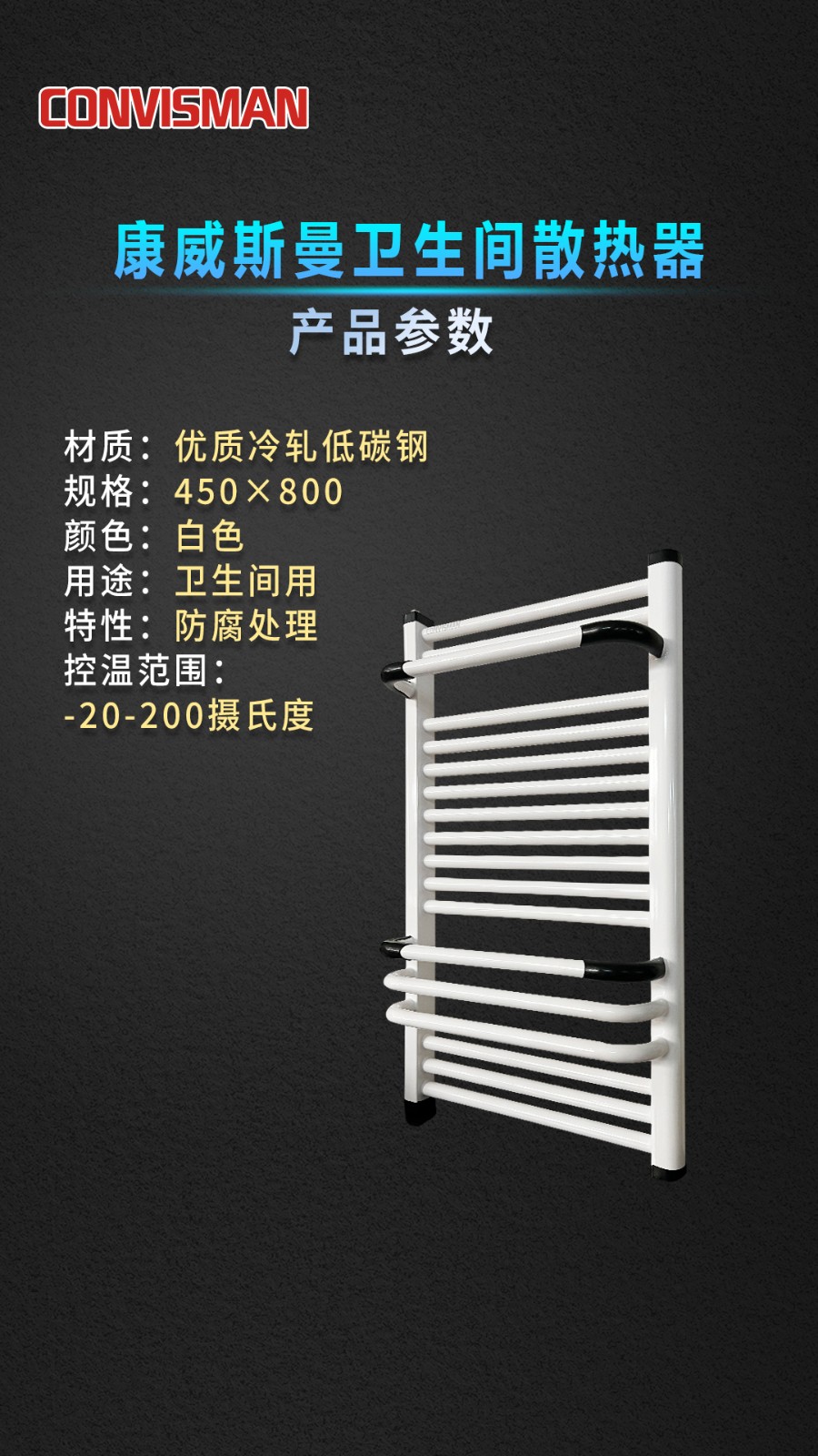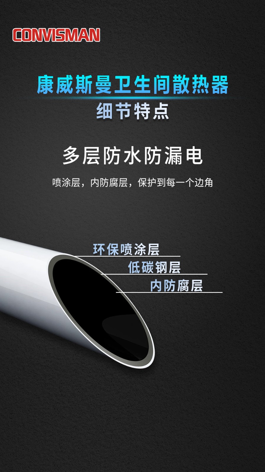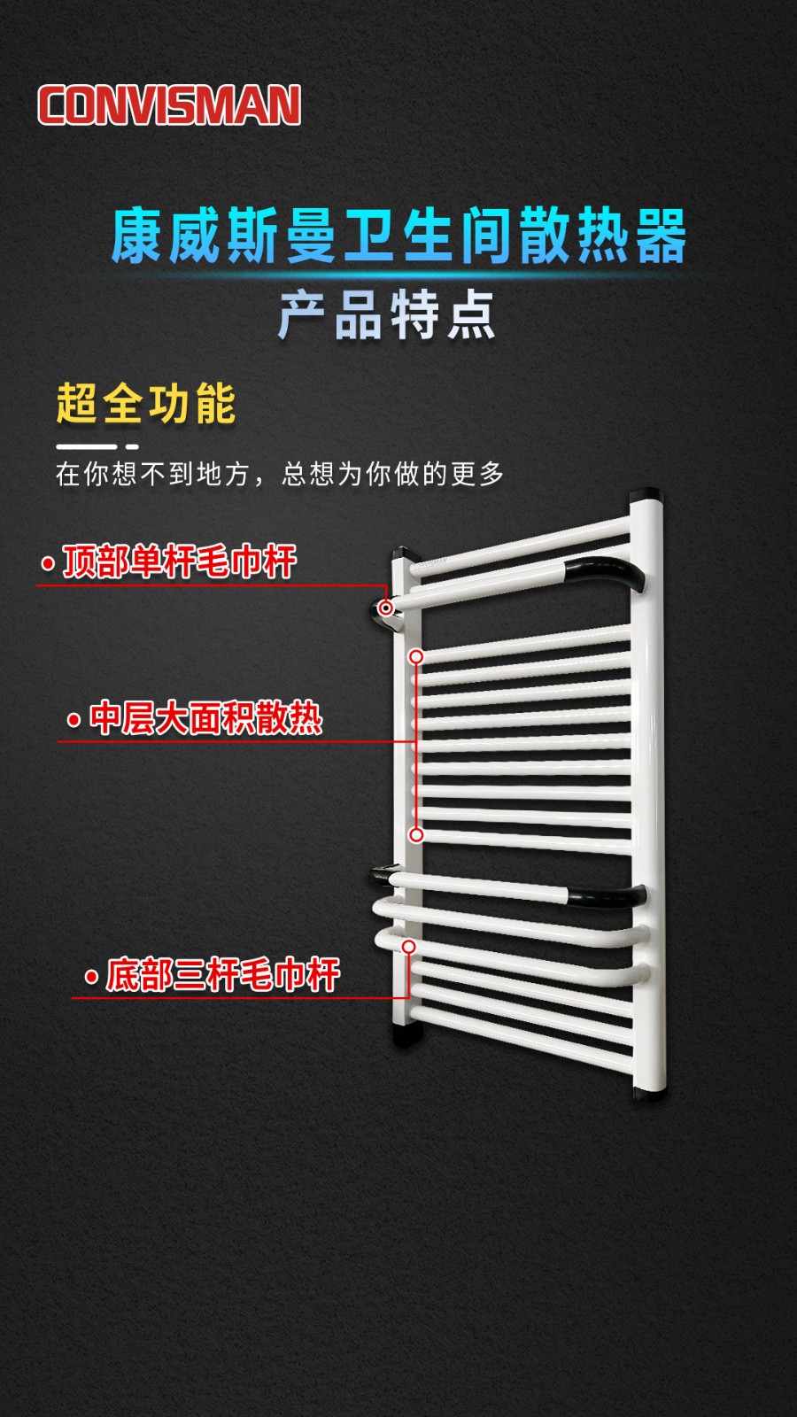 康威斯曼卫生间散热器(圆管):超全功能,做工精细,无缝焊接,品质卓越,静电喷涂,精挑细选,腐蚀钢材,高效抗菌,立体升温,均匀发热,快速烘干,多层防水防漏电。