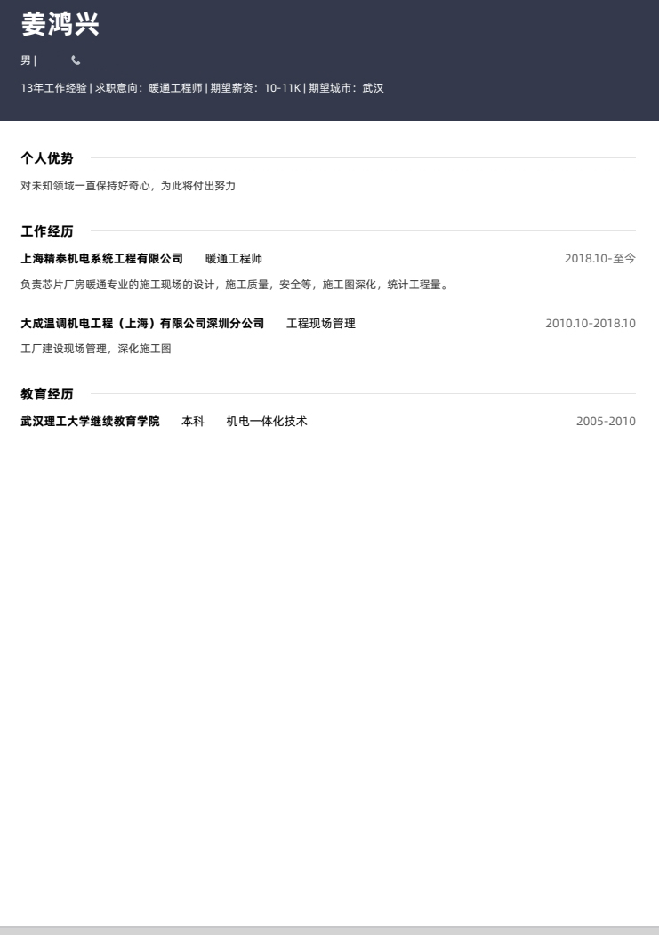 应聘职位:暖通工程师